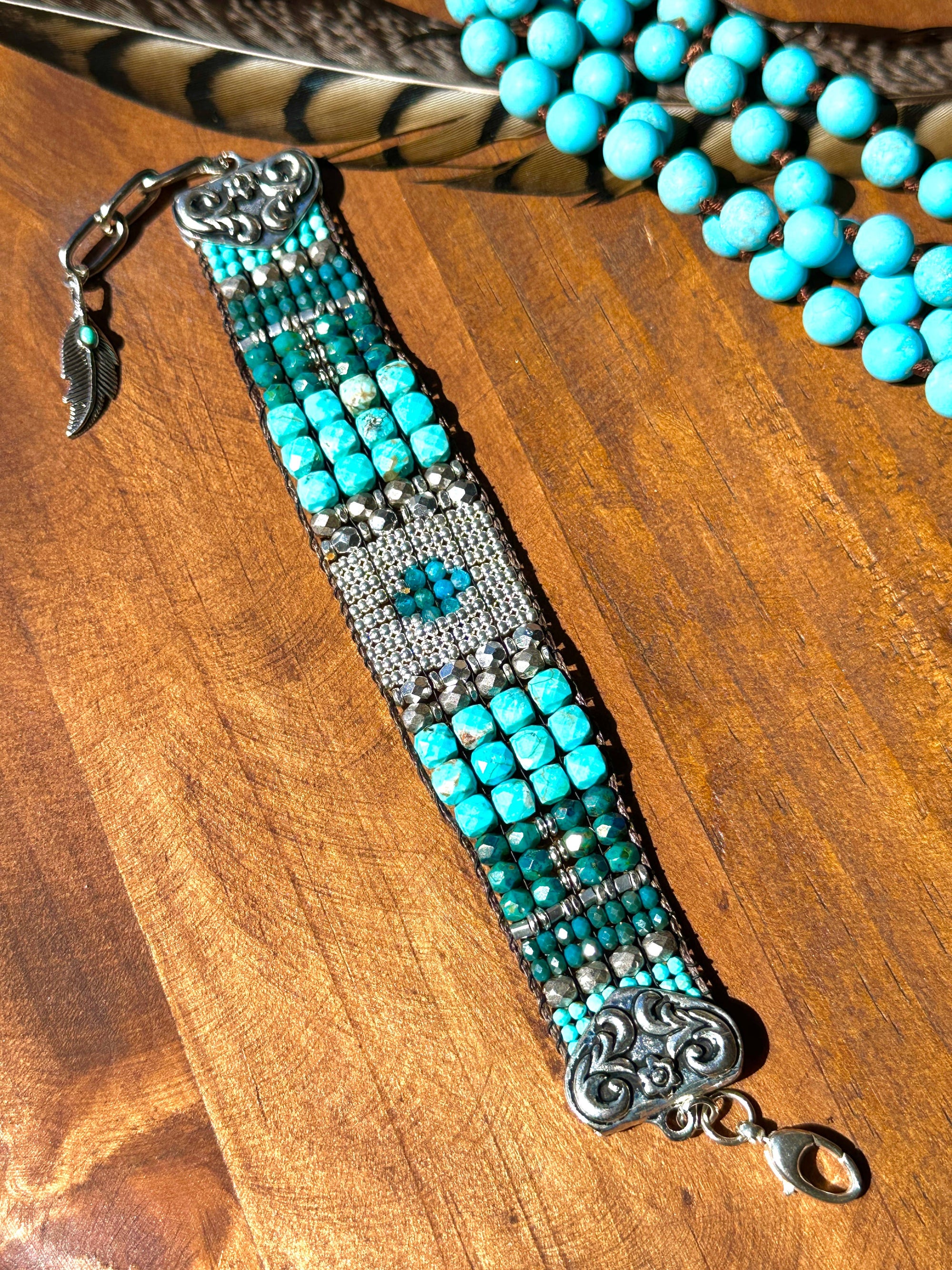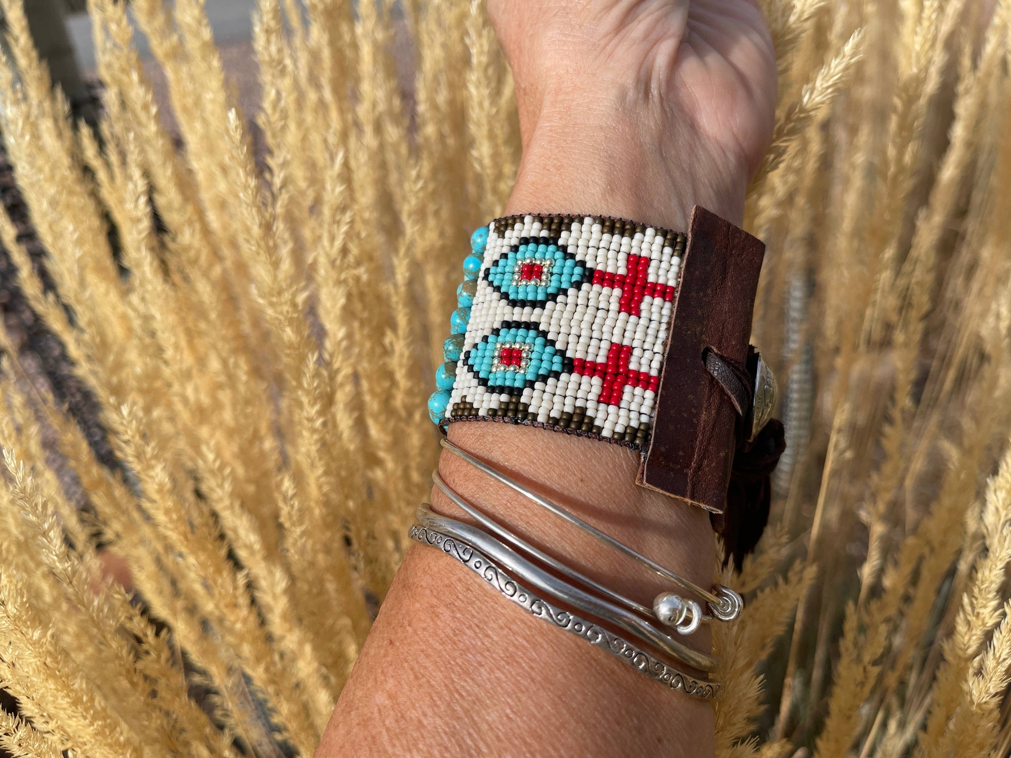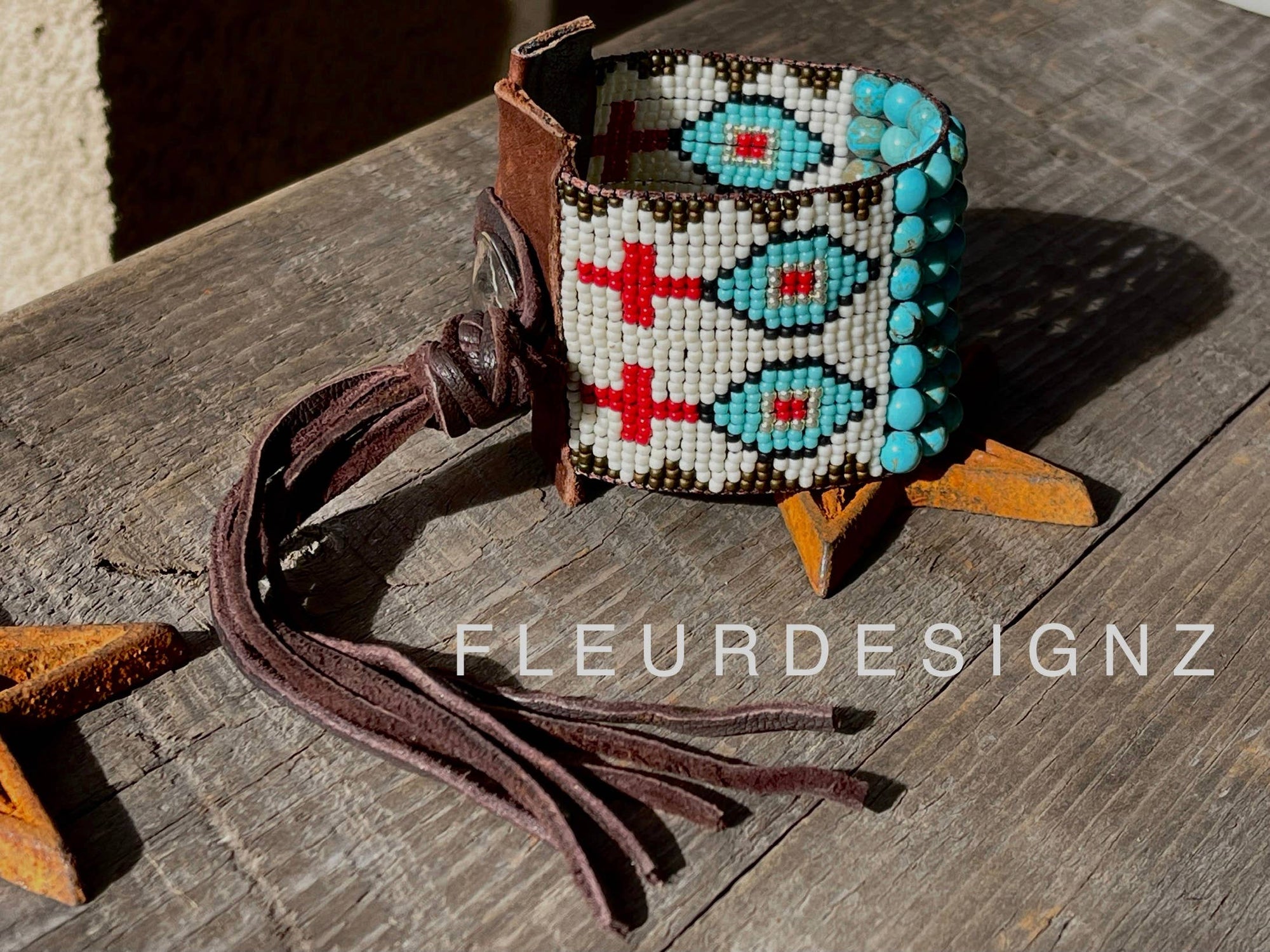 Fleurdesignz Western Jewelry Turquoise And Leather Loom Cuff Bracelet: Prairie Drifter